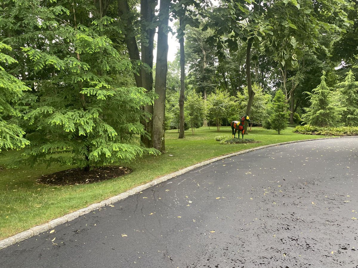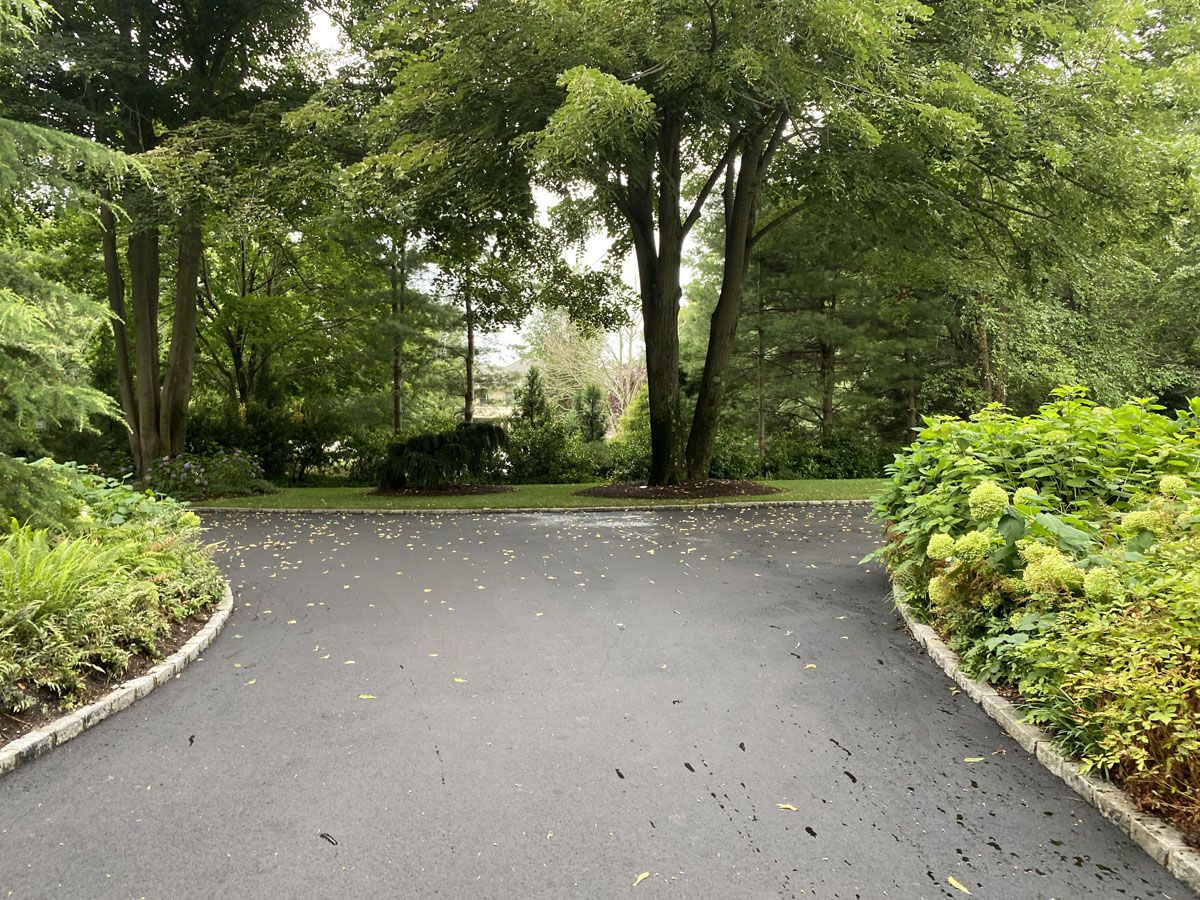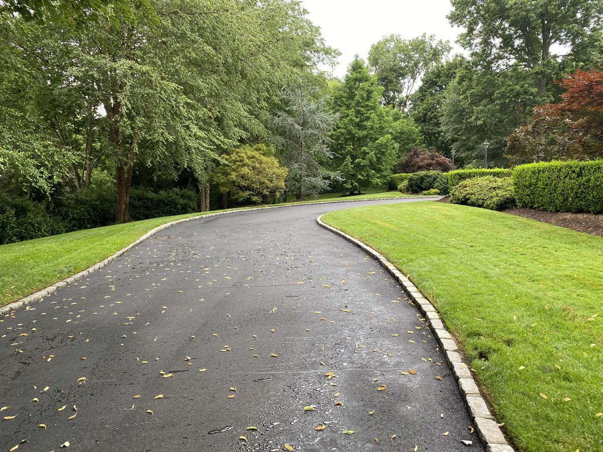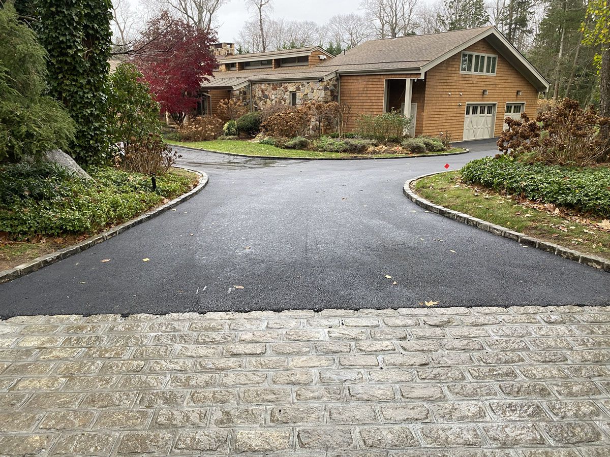 • asphalt blacktop driveway with used belgium block apron